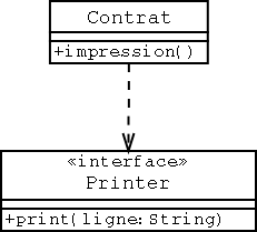 Contrat n'implémente pas l'interface Printer, mais dépend de Printer car il utilise un objet implémentant l'interface Printer dans l'une de ses méthodes.